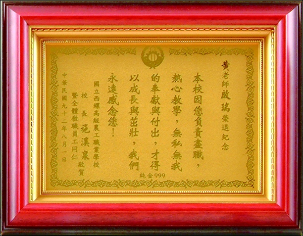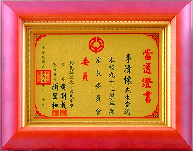 商品編號:Q02 商品名稱:高級壓紋獎牌(台灣實木框) 商品尺寸:外框37*32 建議售價:1600 元 本站優惠價:請來電洽詢!!